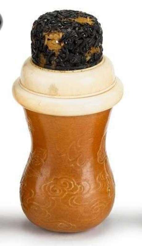 The open-carved shell and ivory-banded cover surmounts a shaped and molded natural gourd.