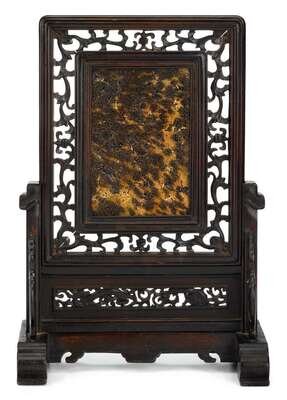 The rectangular shell plaque carved with a detailed, openwork scene of celestial dragons among clouds; openwork hardwood stand of typical form.
