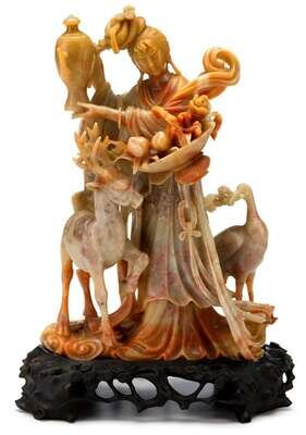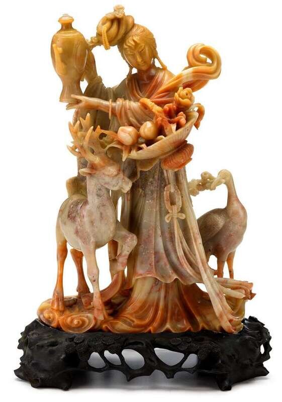 Standing meridian flanked by egret and deer, grasping a basket and ewer, over carved wood stand.