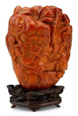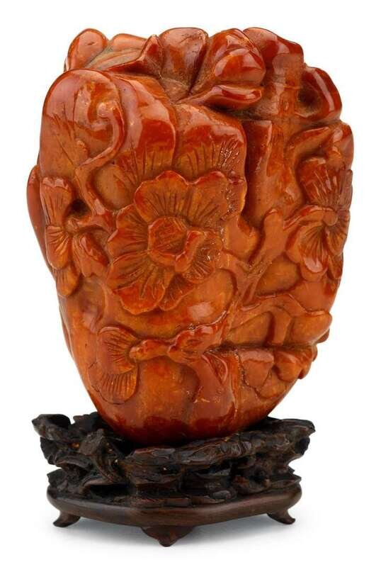 The oval mountain carved to show peony blossoms and vine-work, over wood base.