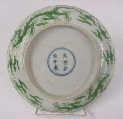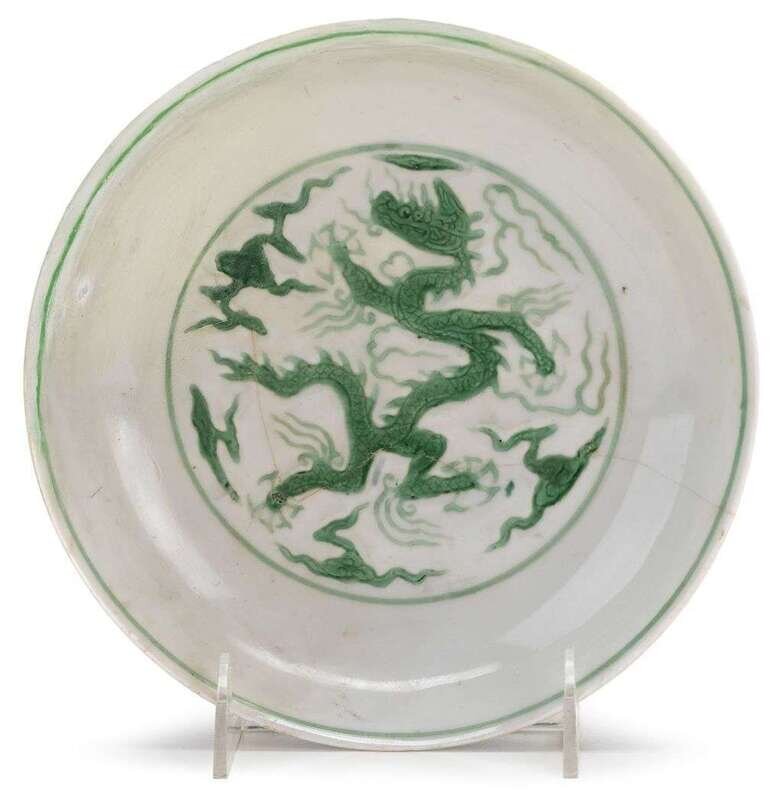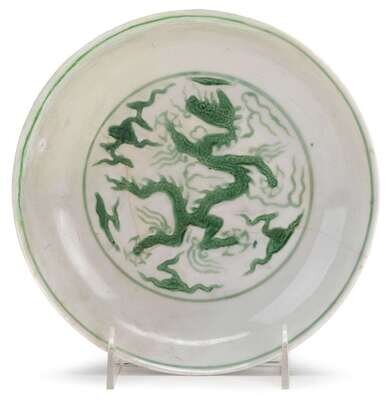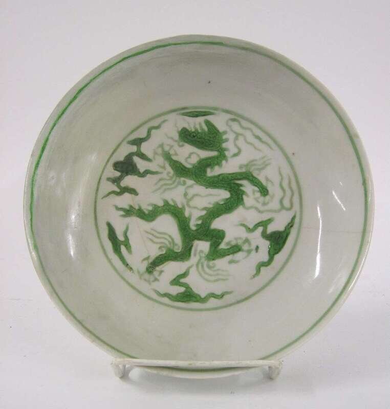 The dish carved to interior and exterior wall and enameled in green to show celestial dragons among clouds; rebuilt.