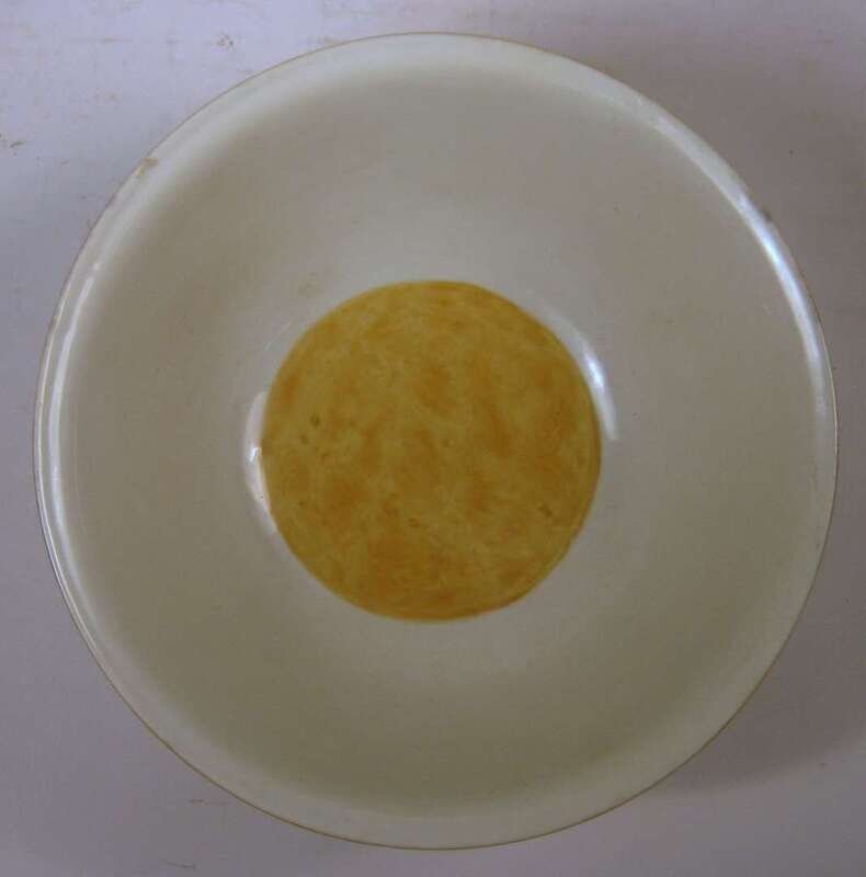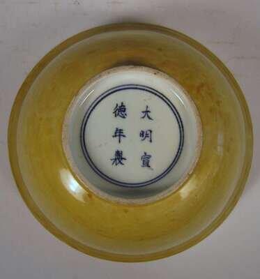 Deep U-shape central yellow medallion to center, the outer walls incised to show peony, Ming six character mark to base, repaired.