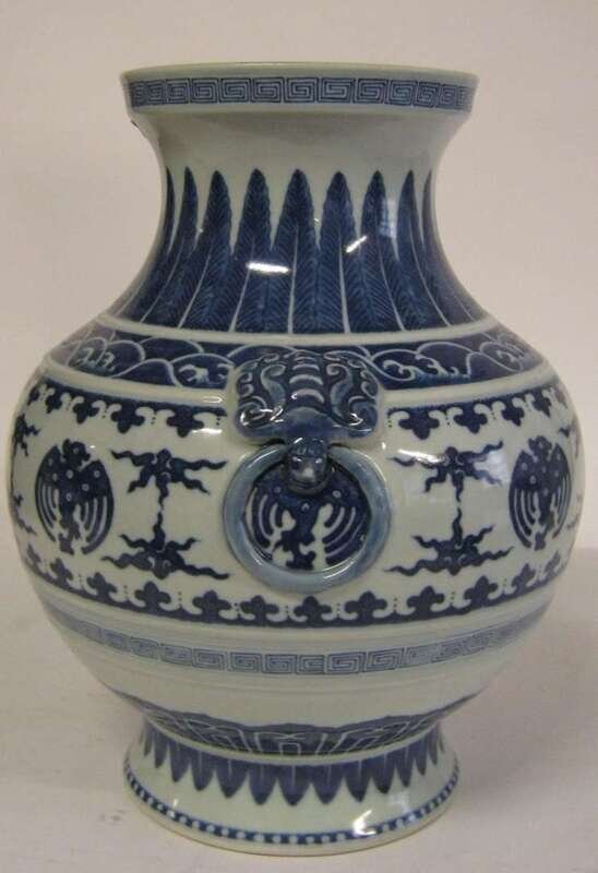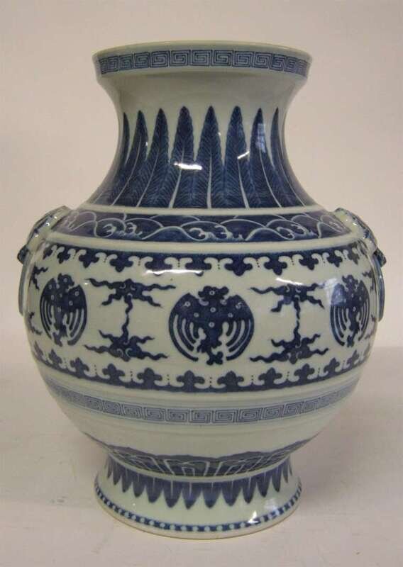 The Ming-style vase with a globular banded body, cupped rim and applied archaic form ring handles decorated throughout in traditional motifs including a central band with stylized phoenix among clouds in simulated heap and pile.