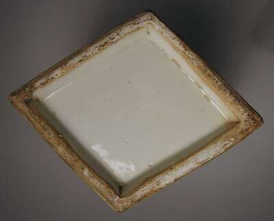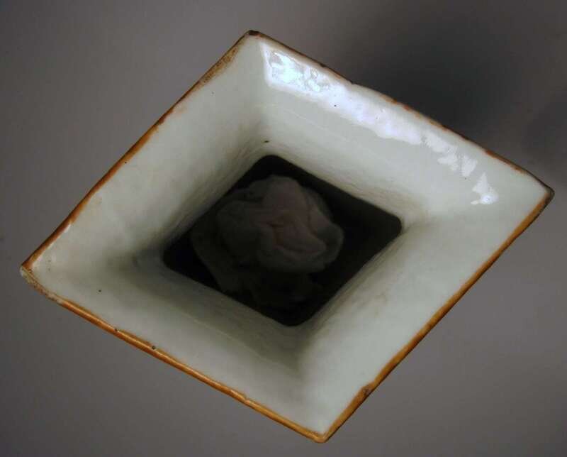 Shaped square baluster form, enameled to four panels of seasonal blossoms within green ground boarder, wood stand.