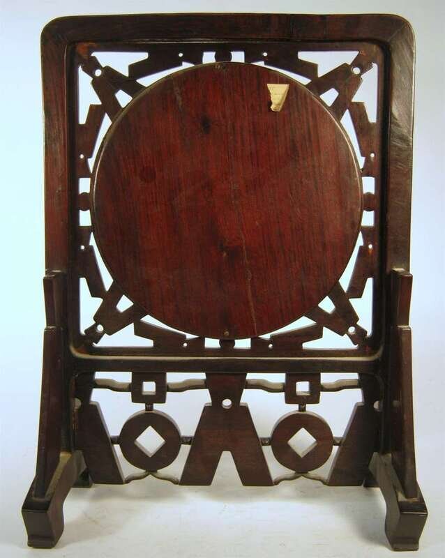 The circular, convex porcelain plaque depicts a qilin and fu bat beneath a spreading pine; set in a later openwork rosewood stand with a geometric design.