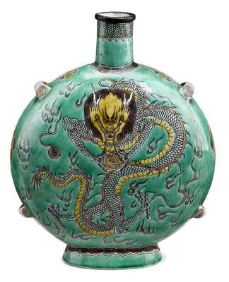 The flattened ovoid vase with four miniature ring handles along sides; both faces enameled green ground and decorated with yellow dragons amongst flames clasping a pearl with shou character.