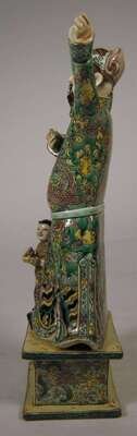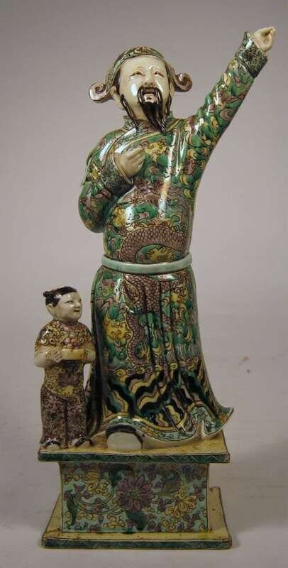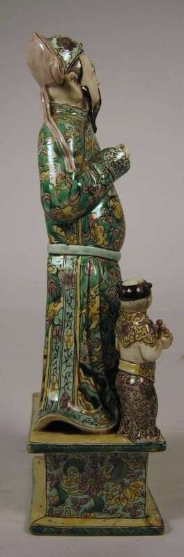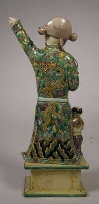 Depicting a standing male dressed in typical dragon and cloud patterned robe; right hand holding a berry and left hand raised; together with a child attendent both figures standing on a pedastol.