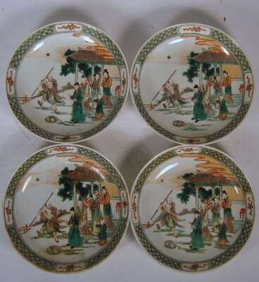each painted to interior with a leisurely outdoor scene encircled by a diaper border and scholarly object cartouches; painted to exterior with three fu bats, raised on circular footring with a dragon mark to center.