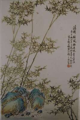 Tall rectanguklar plaque enameled to show bamboo grove with script and Xu seal.