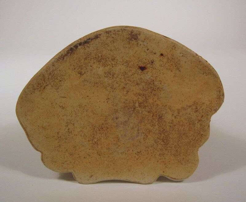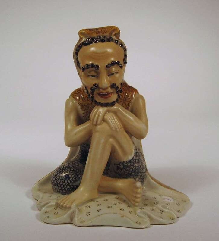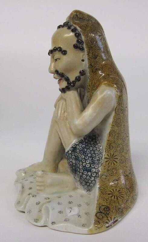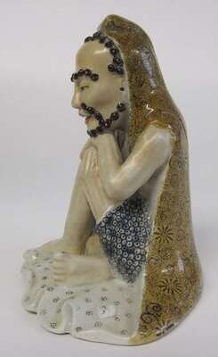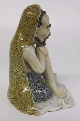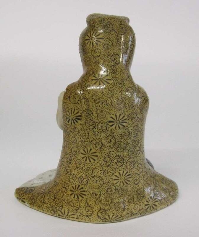 Seated with hands over knees enameled in vibrant tones, buff base.