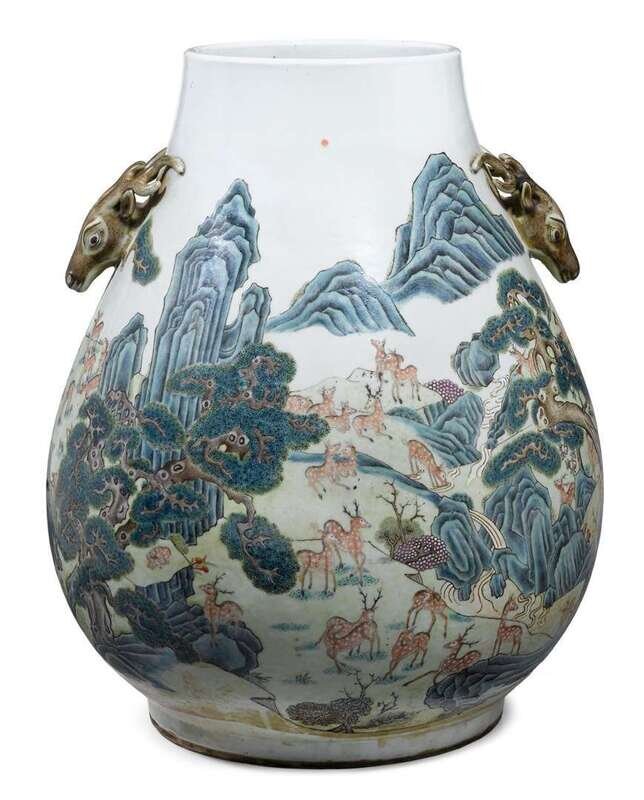 The globular vase painted with a herd of deer,mounted with twin deer head handles.