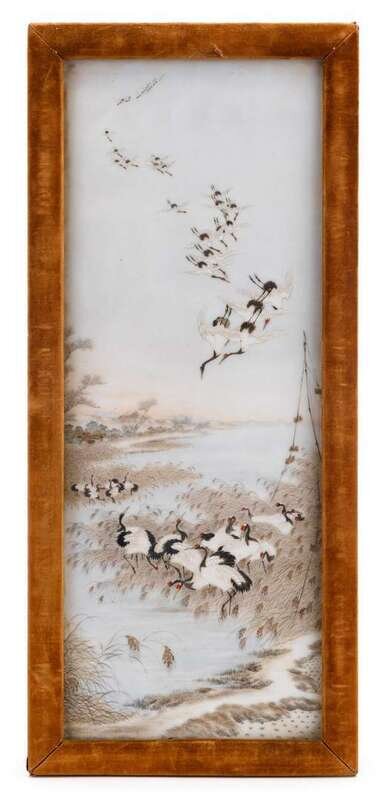 Tall rectangular form, well enameled to show a procession of red-headed cranes, wood and velvet frame.