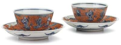 Pair of Chinese iron red and blue glazed porcelain cups and saucers iron-red qianlong mark, 19th century