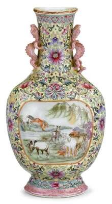 The ovoid bottle-form vase with a flat back vividly enameled with lotus scrolls over a light yellow ground, molded qilong handles to neck and a recessed square cartouche enameled with an image of horses in a landscape.