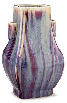 Typical form, rectangular baluster form, molded with lug handles, blue and purple on red glaze to body, unglazed base.