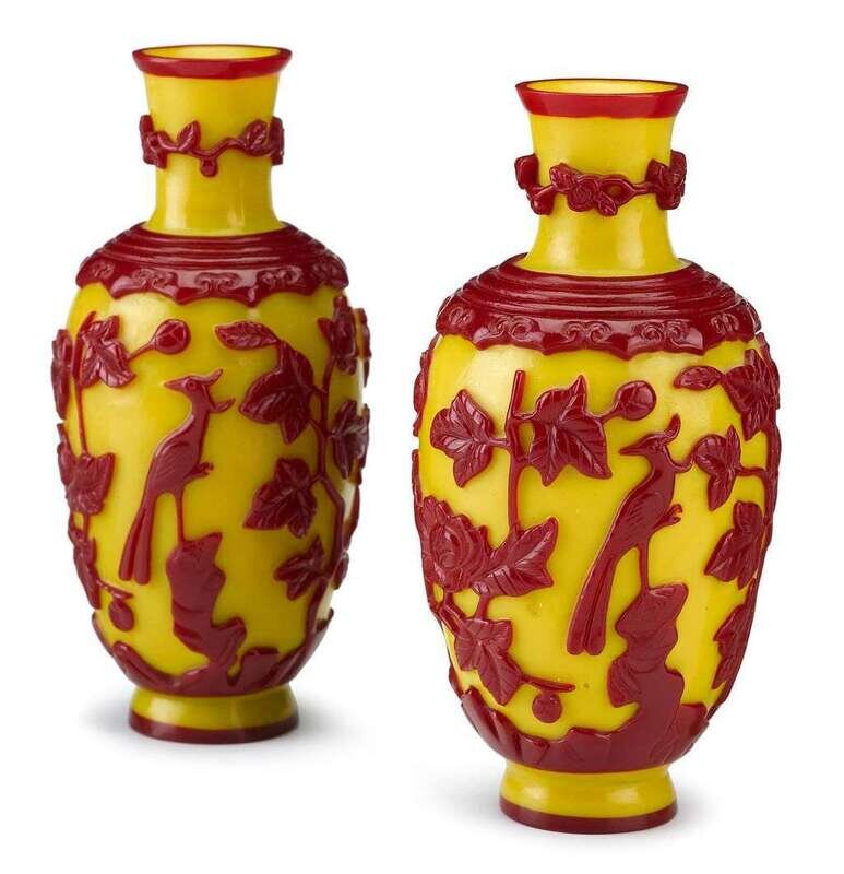 The ovoid vases overlaid with red glass depicting birds and flower blossoms among rockwork formations to body, and scrolling leaf decorations to neck; with a string and lingzhi band at shoulder and a slightly flared rim; raised on circular footring.