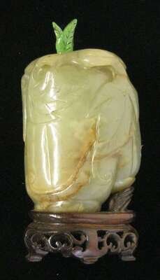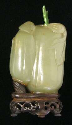 The bottle heavily-carved to resemble two gourds on a leafy vine; celadon hue with some slight brown inclusions; with leaf-form stopper and currently affixed to wooden stand.