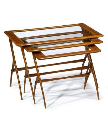 Having a rectangular top with a glass insert on free form tapering legs with a single stretcher.