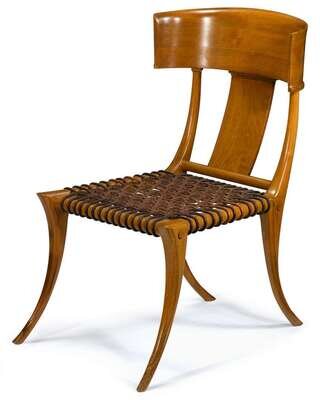 Having a curved straight crestrail and plain splat above a woven leather seat on sabre legs.