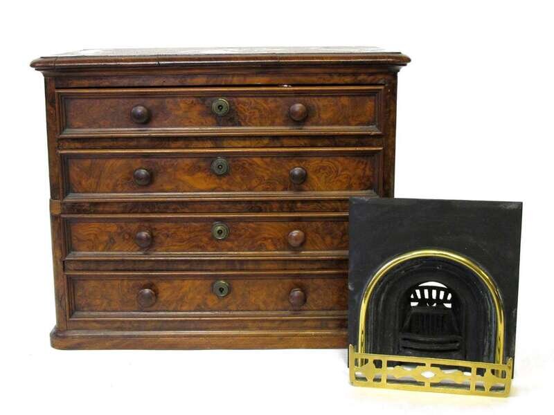 Rectangular top with rounded corners and molded edge above four graduated molded drawers with turned pulls, molded base; together with miniature slate, cast iron, and brass coal fireplace model.
