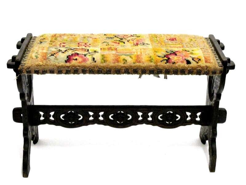 Having a rectangular needlepoint seat above two supports with keyed through tenons and open work medallions and a pierced stretcher.