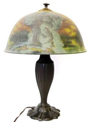 A tall domical reverse-painted shade depicting a landscape scene above a ribbed vasiform standard on a shaped circual base.