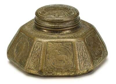 Hexagonal form with zodiac design, glass inkwell, and stamped "Tiffany Studios New York 1072."