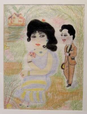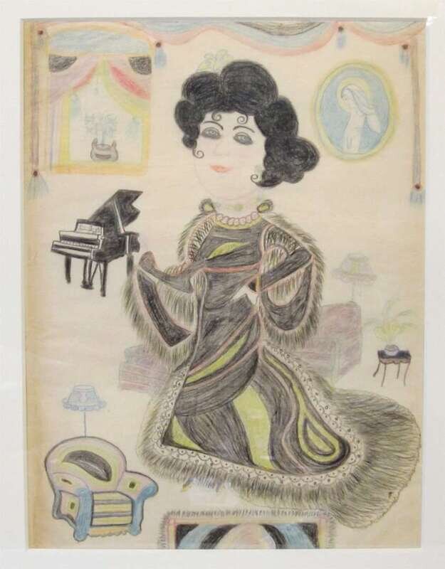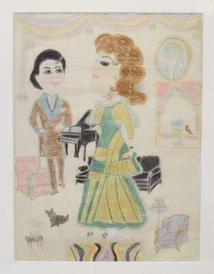 Prismacolor on paper, framed. Four with hand-written titles affixed to versoes: "Mrs. Pierce (2)," "Miss Mary," and "Disturbed, how I wanted to eat my apple," three untitled.