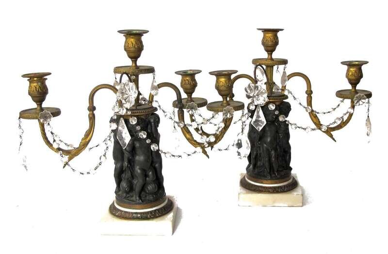 Each with two gilt metal candlearms on bronze figural support, squared marble base, glass and metal swag.
