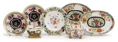 Including a small Worcester covered sauce tureen, a reticulated Dresden plate, pair of polychrome floral Worcester-type dessert plates, a Coalport ink stand and two Imari palette oval platters.