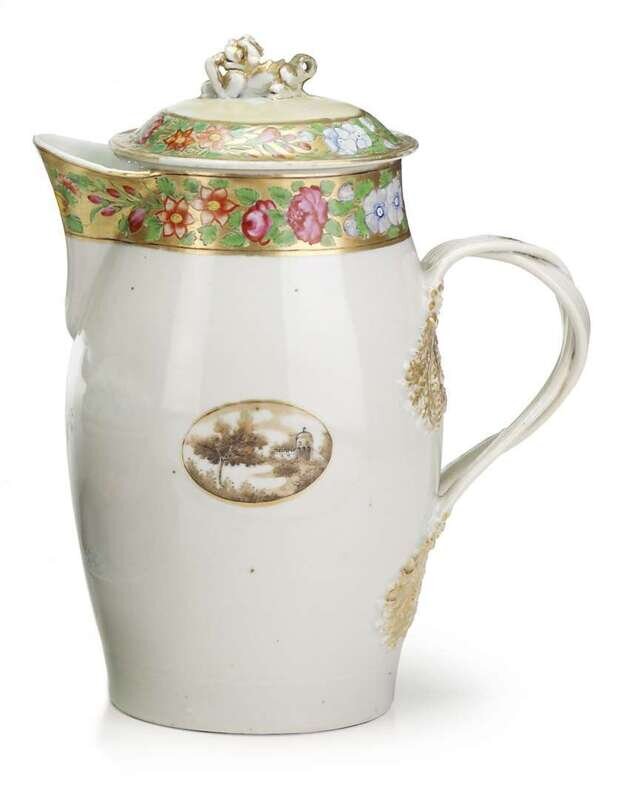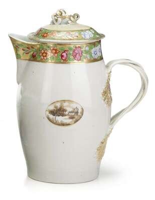 The domed top with foo dog finial and polychrome and gilt floral border, on jug with conforming border and two sepia oval reserves depicting landscapes, entwined handle.