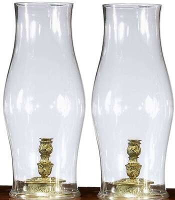 Pair of Continental brass candlesticks with blown glass hurricane shades 18th/19th century