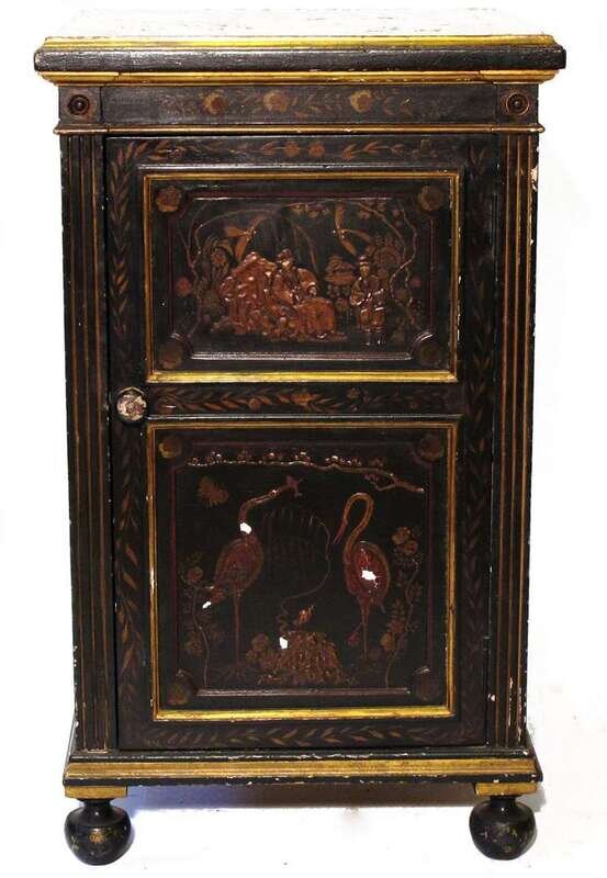The molded cornice above double paneled door and sides, all decorated with polychrome Asian scenery and figures.