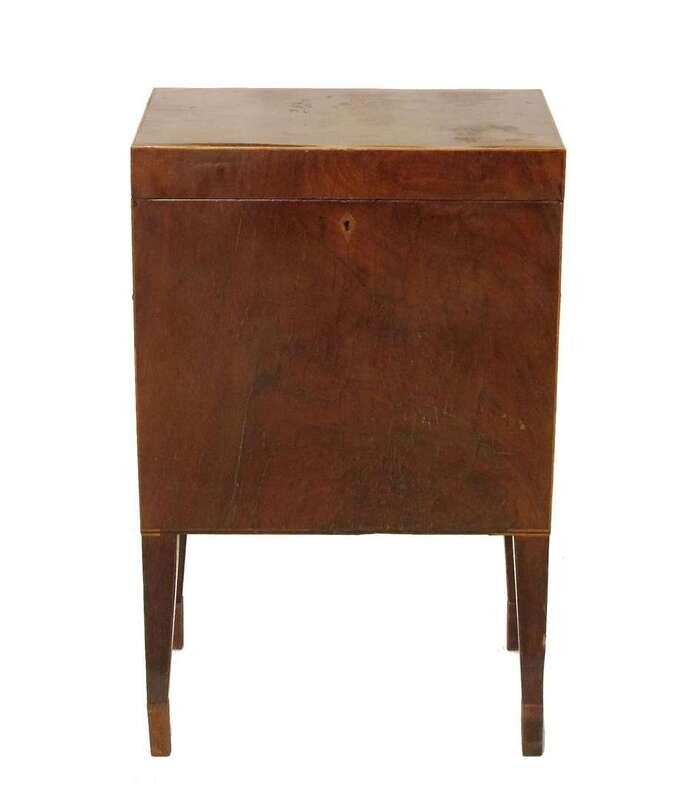 The rectangular hinged lid with inlaid edge lifts to reveal a fitted interior on square turned tapering legs.