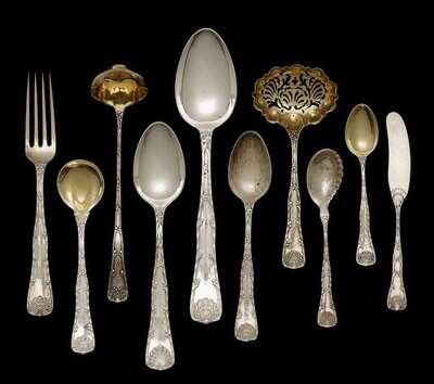 "Wave Edge" pattern comprising eighteen dinner forks, twelve flat handle butter spreaders, eleven teaspoons, twelve vermeil cream soup spoons, eleven soup spoons, six serving spoons, ten vermeil demitasse spoons, twelve egg spoons, a vermeil sauce ladle, and a vermeil berry spoon, monogram. .