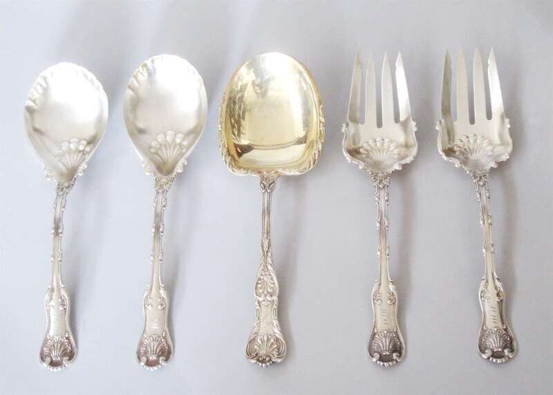 "Imperial Queen" pattern; together with a large serving sterling vermeil serving spoon by Gorham in the "King George" pattern, monogram.