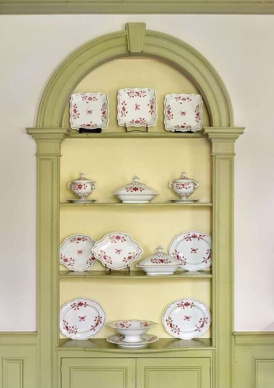 Each with impressed mark, crown over FBB, decorated with iron red and pink floral vine, with a beaded gilt band border, including: five platters, two urn form tureens with underplates, two covered vegetables, three squared serving dishes, two oval serving dishes, one centerpiece with stand, sixteen soup plates, nineteen dinner plates and fourteen dessert plates.