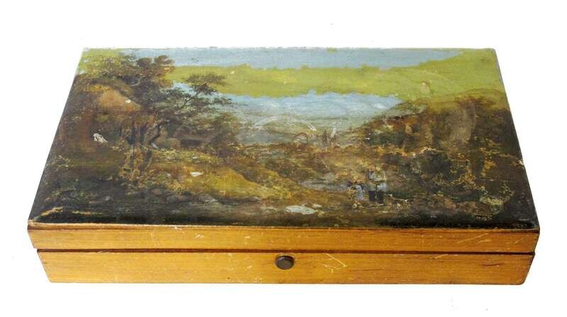 The lid of rectangular box painted with a landscape with two people and a dog.