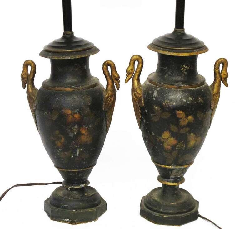 With cast swan form handles, painted black with gilt highlights, fitted as lamps.
