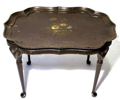 The tray top with serpentine edge decorated with polychrome floral spray and gilt flourishes, on outset flower-decorated knees and turned tapering legs ending in pad feet.