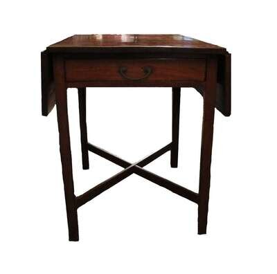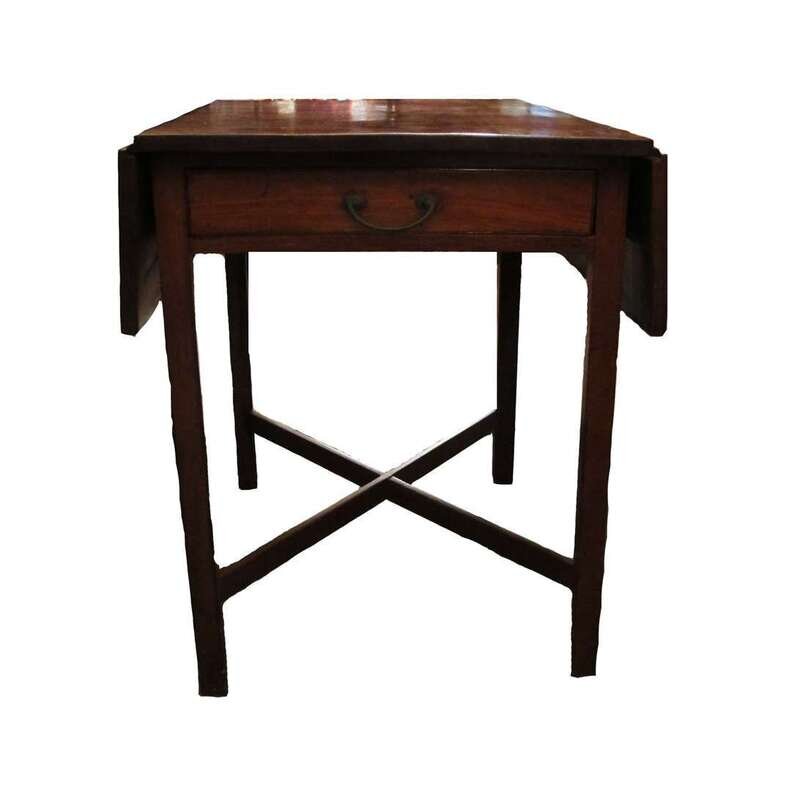 The rectangular top with conforming leaves above frieze fitted with single drawer on squared tapering legs joined by cross stretchers.