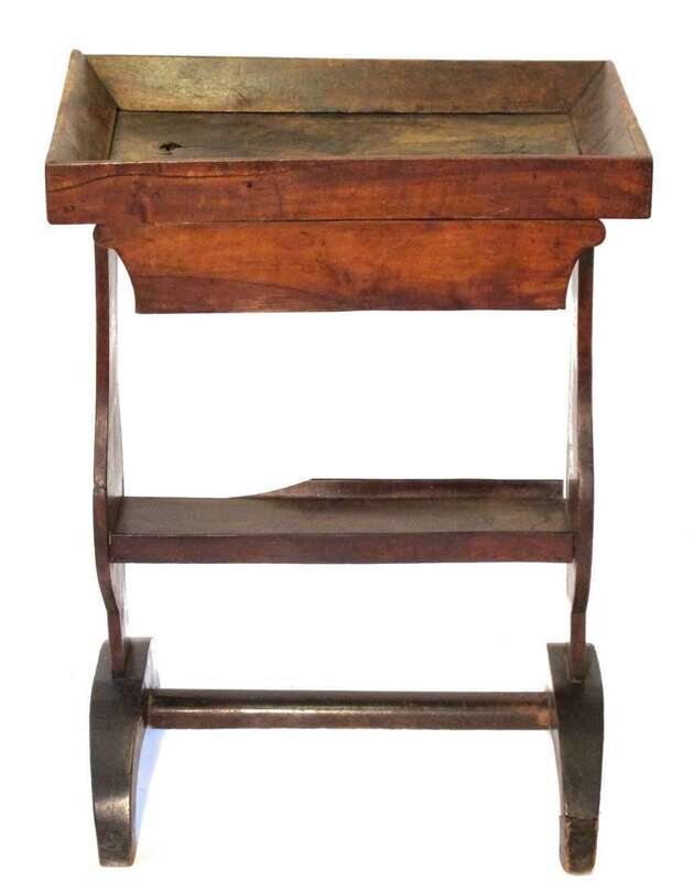 A rectangular tray with canted sides above shaped drawer on urn shaped supports joined by medial shelf, trestle base.
