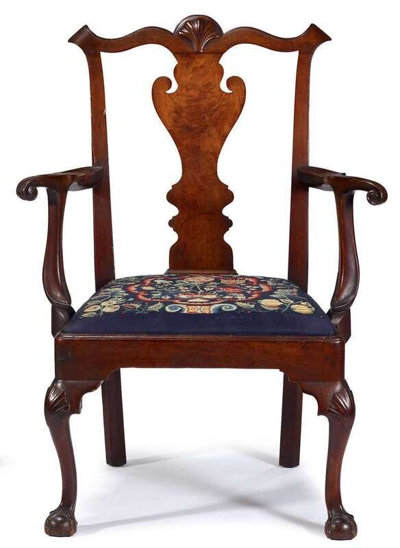 The serpentine crestrail centering a shell above a vasiform splat, shaped arms with carved handholds, trapezoidal seat with late 18th/early 19th century needleworked cover depicting vase of flowers enclosed by scrolls, cabriole legs with shell-carved legs ending in ball and claw feet.