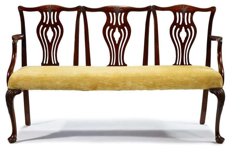 The carved serpentine crestrail above pierced urn form splats, shaped arms on upholstered seat, carved cabriole legs.