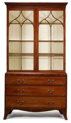 Dentil molded cornice with "Gothic" drops above two "Gothic" mullioned glazed doors opening to three shelves on case fitted with three graduated beaded drawers on tall French feet, string inlay throughout.
