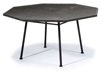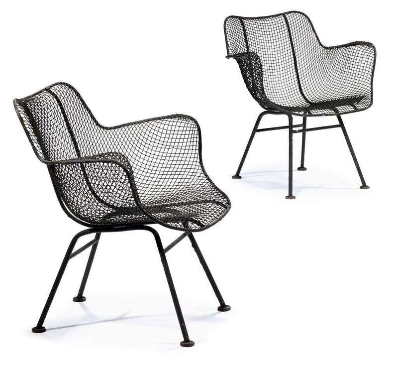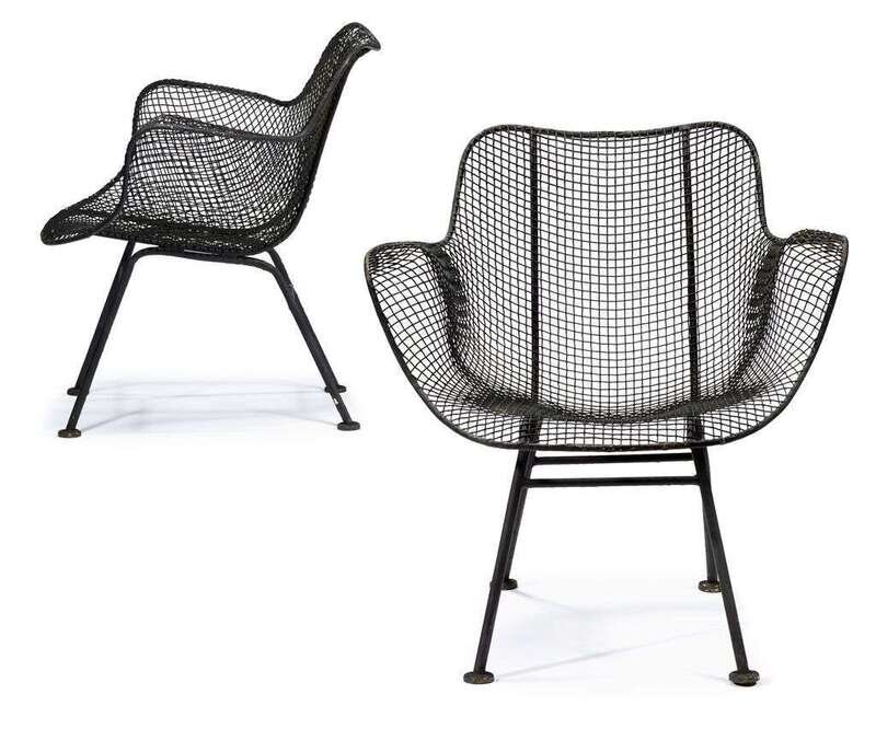 Four "Sculptura" wirework and iron chairs and table russell woodard, owosso, mi, circa 1965