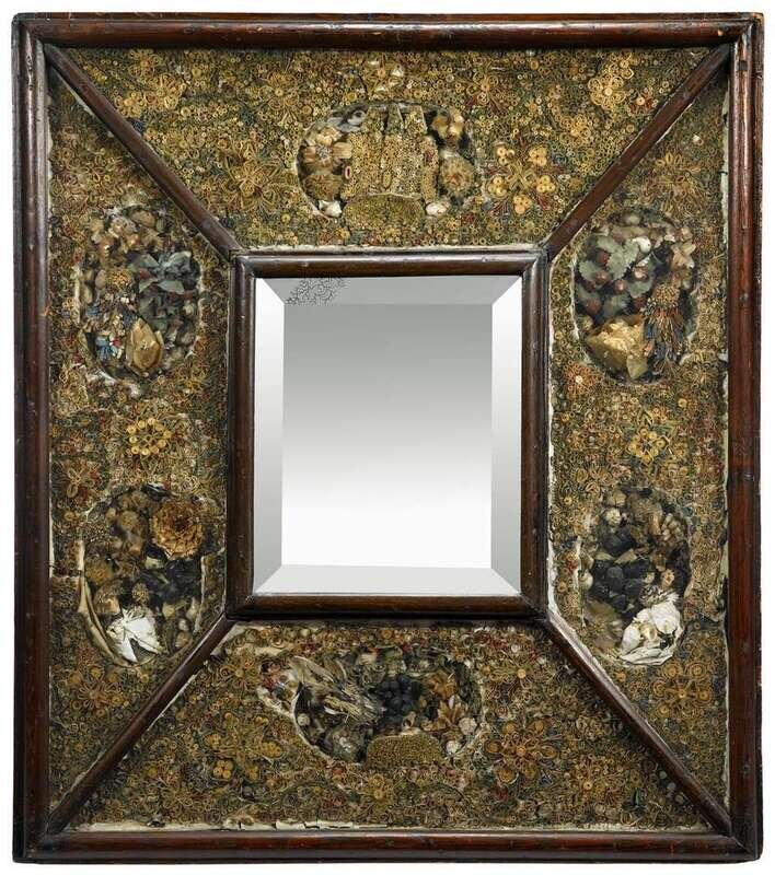 Rectangular frame with four quillworked panels of flowers and scrolls, each centering a vignette with castle, birds and flowers, figures and a nesting bird centering a mirror plate, worked with paper, shells, fabric and feathers.
