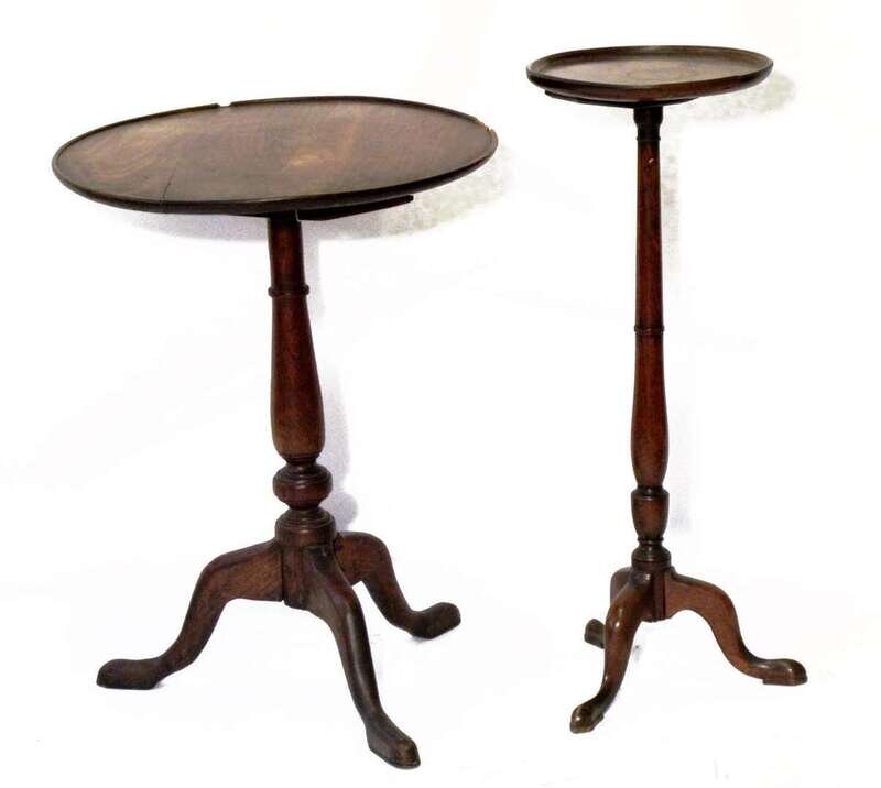 Circular molded edge top fixed on a ring turned and slender vasiform shaft, cabriole legs with snake head feet; together with a kettle stand with circular molded top on tapering vase-turned support on cabriole legs ending in slipper feet.