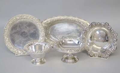 Comprising two circular footed candy dishes, a circular salver, and an oval bread tray; together with a sterling silver repoussé dish by J.F. Fradley, monogram.