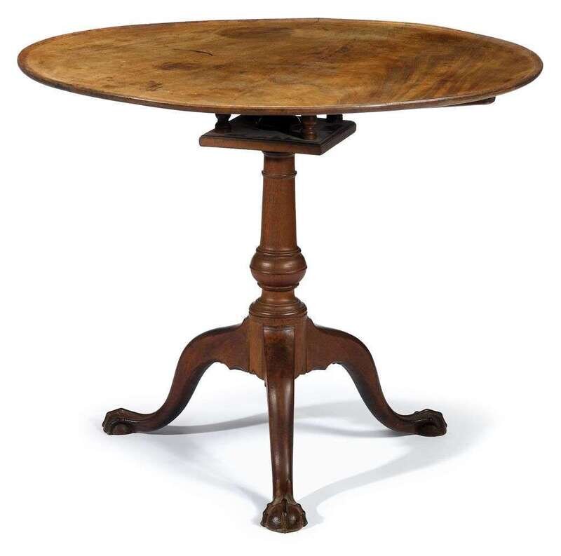 The circular molded top tilts on birdcage and tapering belted suppressed ball support on cabriole legs ending in ball and claw feet.